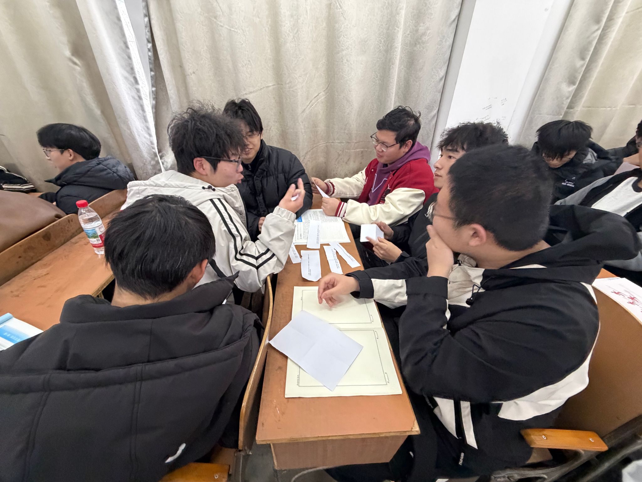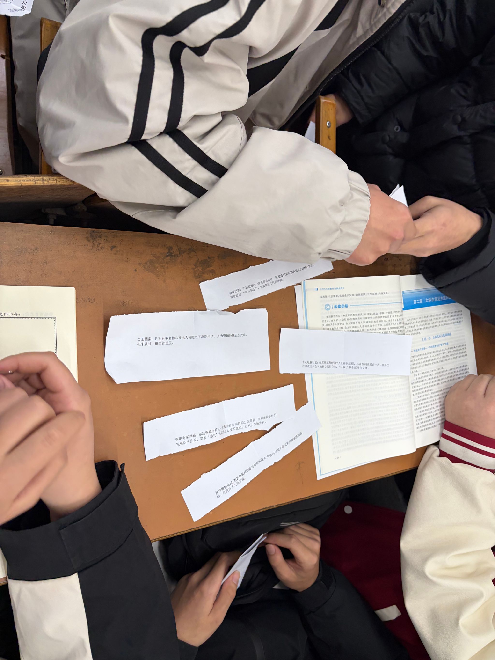 本次生涯剧本杀以智能驾驶解决方案提供商“智行科技”算法泄露危机为故事背景,紧扣智能车辆领域职业发展方向,精心设计算法工程师、硬件工程师、产品经理、数据分析师、市场营销专员、人力资源经理六大核心职业角色,每个角色均贴合行业实际,涵盖技术研发、产品运营、市场推广、人才管理等多个职业维度。在姜淑瑜的引导下,学生以小组为单位随机抽取角色剧本,沉浸式走进职业场景:从研读剧本熟悉职业背景、任务与核心能力要求,到线索搜证甄别加密文件、可疑邮件等关键信息,再到公开讨论、一对一私聊梳理逻辑,最后集中推理、匿名投票指认“泄露者”,学生们全程全情投入,在角色扮演与逻辑推理中,直观了解智能车辆领域不同职业的工作内容、核心素养与岗位要求。